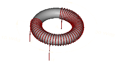 Man benötigt zum Bewickeln ungefähr 1.1m CuL Draht Æ 0.3mm (Æ 0.4mm). Zuerst wickelt man 30 Windungen auf den Kern und macht dann eine Schlaufe. Danach die anderen 15 Windungen gleichsinnig weiterwickeln. Anschließend (oder auch gleich) wird die Schlaufe verdrillt und ergibt so den Mittelanschluß der Spule. Man muß sehr eng wickeln, sonst bekommt man nicht alle Windungen auf den Kern. Nachdem die Platine fertig bestückt und abgeglichen ist, sollte man unbedingt den Ringkern mit etwas Klebstoff auf ihr befestigen. Den CuL Draht muß man natürlich vor dem Einlöten verzinnen. Das geht am Besten, wenn man die Anschlußdrähte noch nicht gekürzt hat.